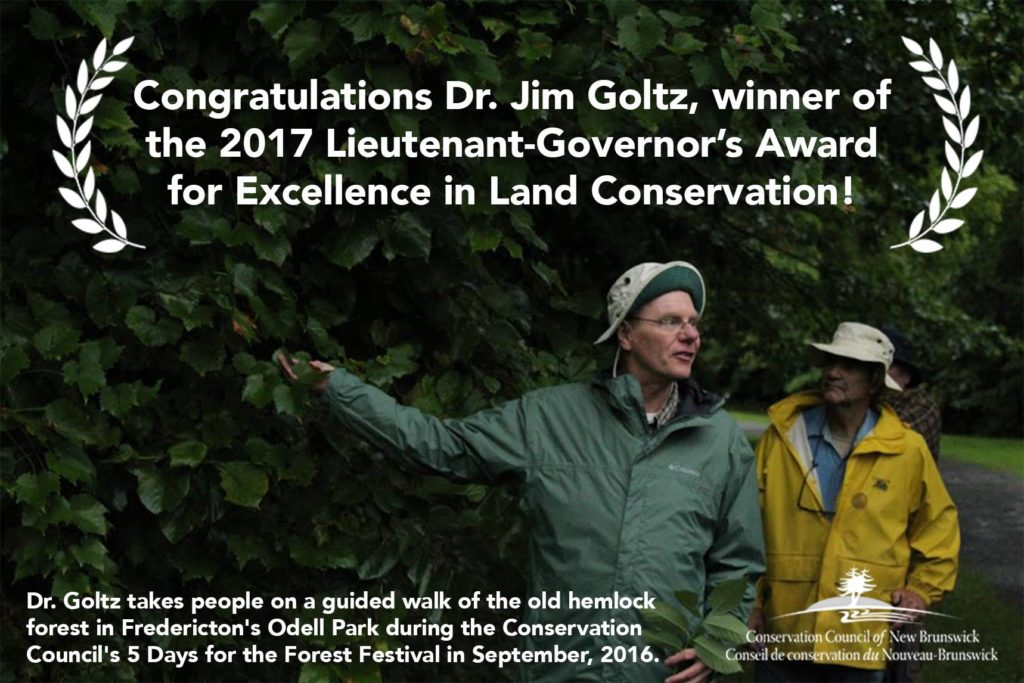 “Learn them, love them, protect them,” Jim Goltz quoted his late friend, Hal Hinds, at a guided walk of Odell Park that opened the Conservation Council’s 5 Days for the Forest event last September. It’s this love of nature that Jim inspires in all those who have the opportunity to listen to him speak. With that in mind, we couldn’t be more proud of our dear friend and supporter for winning the Nature Trust of New Brunswick’s 2017 Lieutenant-Governor’s Award for Excellence in Land Conservation. Congratulations, Jim!
