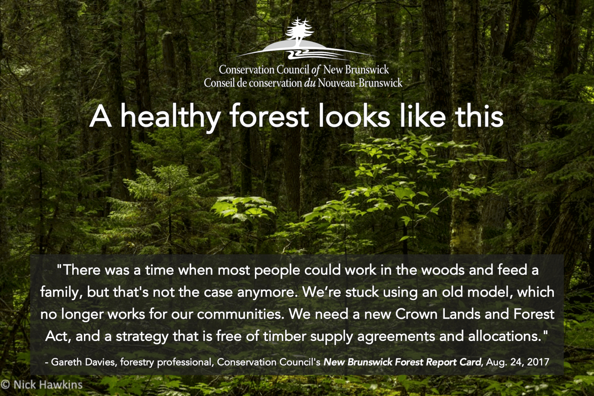 New Brunswickers have repeatedly expressed a desire for changes in the way our Crown forest is managed. The people of the province want to save animal populations decimated by overcutting and clearcutting, stop the damage to our rivers and lakes, and diversify our forest-based economy.