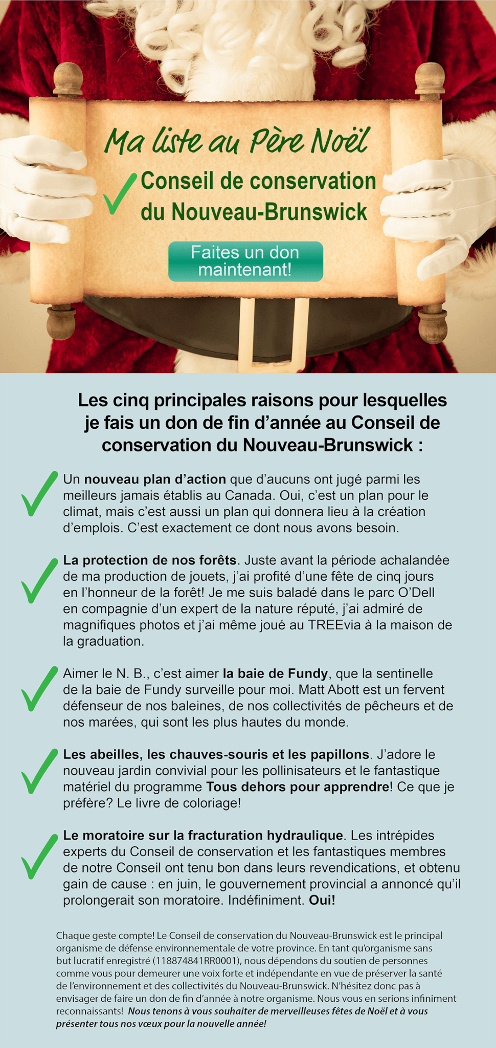 Facile : consultez la liste du Père Noël pour découvrir ses cinq bonnes raisons de faire un don de fin d’année au Conseil de conservation!
