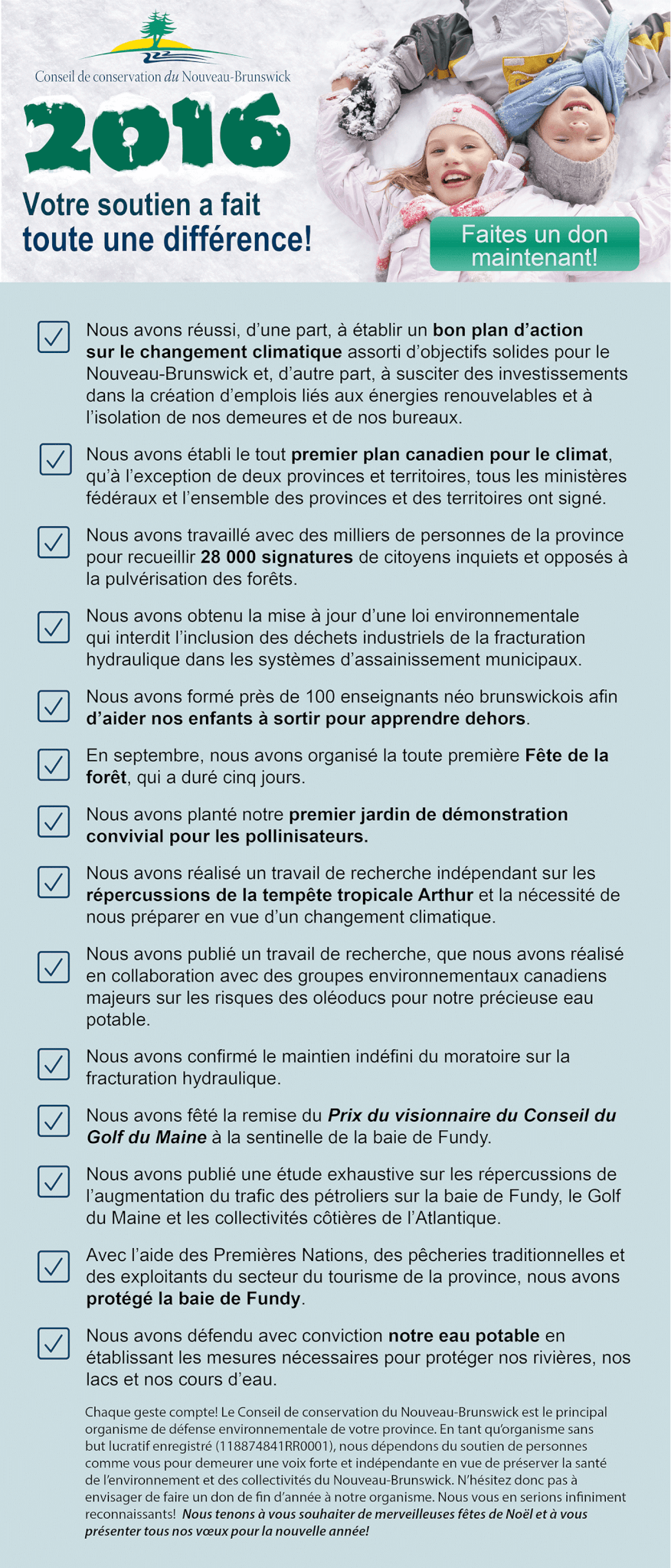 Et aucune d’entre elles n’aurait pu voir le jour sans votre soutien. C’est grâce à des gens comme vous que le CCNB peut trouver des solutions concrètes qui aident les gouvernements, les entreprises et les familles à protéger notre air, notre eau, notre terre et nos forêts. Voici juste quelques?uns des objectifs que nous avons atteints en 2016, et qui permettront à tout le monde d’amorcer 2017 avec le sourire aux lèvres!