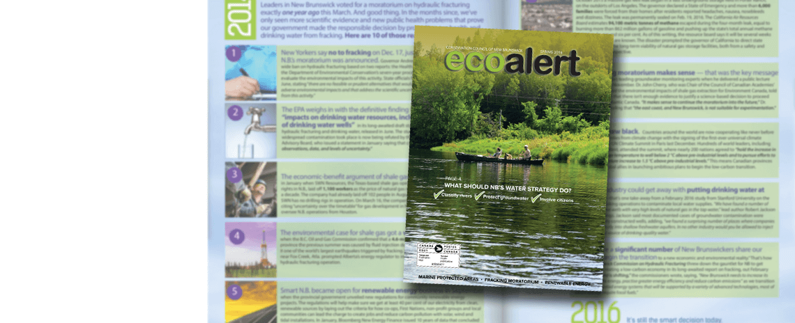 EcoAlert is the Conservation Council of New Brunswick’s membership magazine. It brings you environmental news, exciting stories of positive change happening in our communities, and important action alerts from across our province. We share stories of the work we’re doing in our program areas – including Freshwater Protection, Climate & Energy, Marine Conservation and Forest Protection – as well as updates on our Community Projects such as Buy Local NB and Learning Outside. See below for more on how to use our EcoAlert online edition.