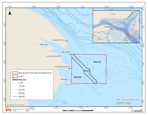 The Banc-des-Américains (American Bank) Marine Protected Area (MPA) received final approval on March 6, 2019 and is now the largest offshore protected area in the Gulf of Saint Lawrence (GSL). The final boundaries are shown below and encompass an area of one thousand square kilometres (1,000 km2).