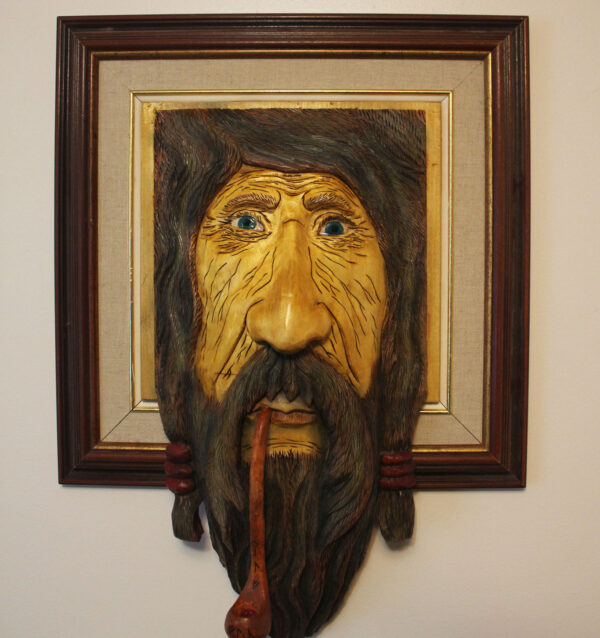 ‘Framed.’ This sculpture creates a story of a young man when first placed in the frame many years ago and hung on the wall. But years later, after spending his entire life in the same house and on the same wall, the image has aged and grown out of the frame. The writing on his pipe is in Dwarven, from Lord of The Rings, and states the following, just for fun. -On the bowl: (G.A.C) Gary A Crosby, the artist name that created this sculpture.