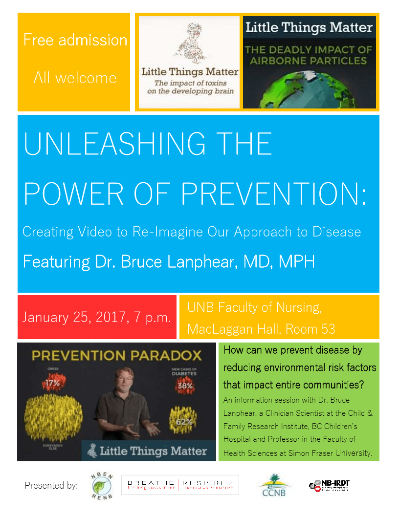 How can we prevent disease by reducing environmental risk factors that impact entire communities? An information session titled “Unleashing the power of Prevention: Creating Video to re-imagine our approach to disease” will take place at UNB with Dr. Bruce Lanphear, MD, MPH and Clinician/Scientist at the Child & Family Research Institute of B.C. Children’s Hospital and Professor in the Faculty of Health Sciences at Simon Fraser University.