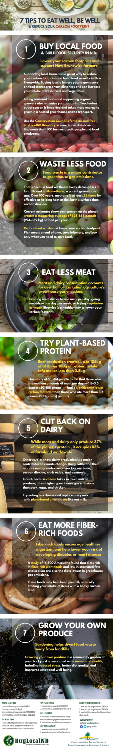Buy local food and build food security in New Brunswick: Supporting local farmers is a great way to reduce your carbon footprint and build food security in New Brunswick. Buying locally lowers your dependence on food transported vast distances and can increase your intake of fresh fruits and vegetables.