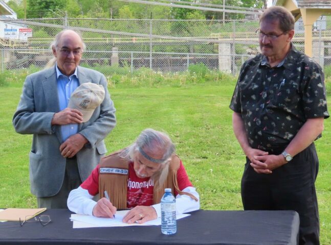 Following the sacred run, on Thursday, May 26, a ceremony was held to sign the Statement of Cooperation between Passamaquoddy leadership and leaders from U.S. federal agencies, Maine state agencies, and Fisheries and Oceans Canada that pledges “to continue to work together toward the common goal of restoring alewives and other sea-run fish to this magnificent river, which will restore the cultural connection between the people of the Tribes/Nation and the Passamaquoddy Bay ecosystem.”